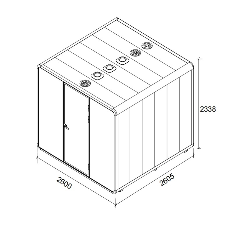 | Dimensione esteriore: | W2600*D2605*H2338MM | Materiali: | Acciaio, alluminio, pannelli acustici in fibra, vetro stratificato |