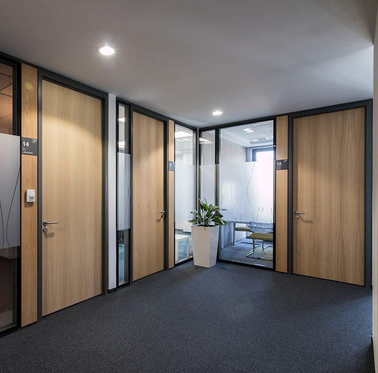5) Controllo acustico superiore: Le pareti divisorie possono essere progettate per un eccellente isolamento acustico, utilizzando vetro stratificato, doppi vetri, anime isolanti e guarnizioni acustiche per raggiungere elevati STC.